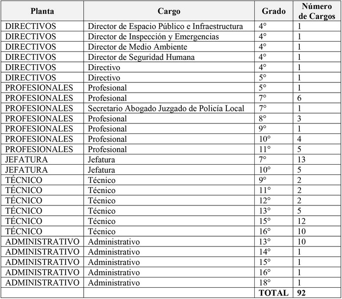 a. La creación de 92 cargos nuevos: 6 cargos en el escalafón de directivos; 21 cargos en el escalafón de profesionales; 18 cargos en el escalafón de jefaturas; 33 cargos en el escalafón de técnicos, y 14 cargos en el escalafón de administrativos. En consecuencia, se cumple con lo establecido en el Nº 4, del artículo 49 bis, de la ley Nº 18.695, que exige: "En caso que se incremente el número total de cargos en la planta de personal, a lo menos un 75% (setenta y cinco por ciento) de los nuevos cargos que se creen deberán requerir título profesional o técnico".