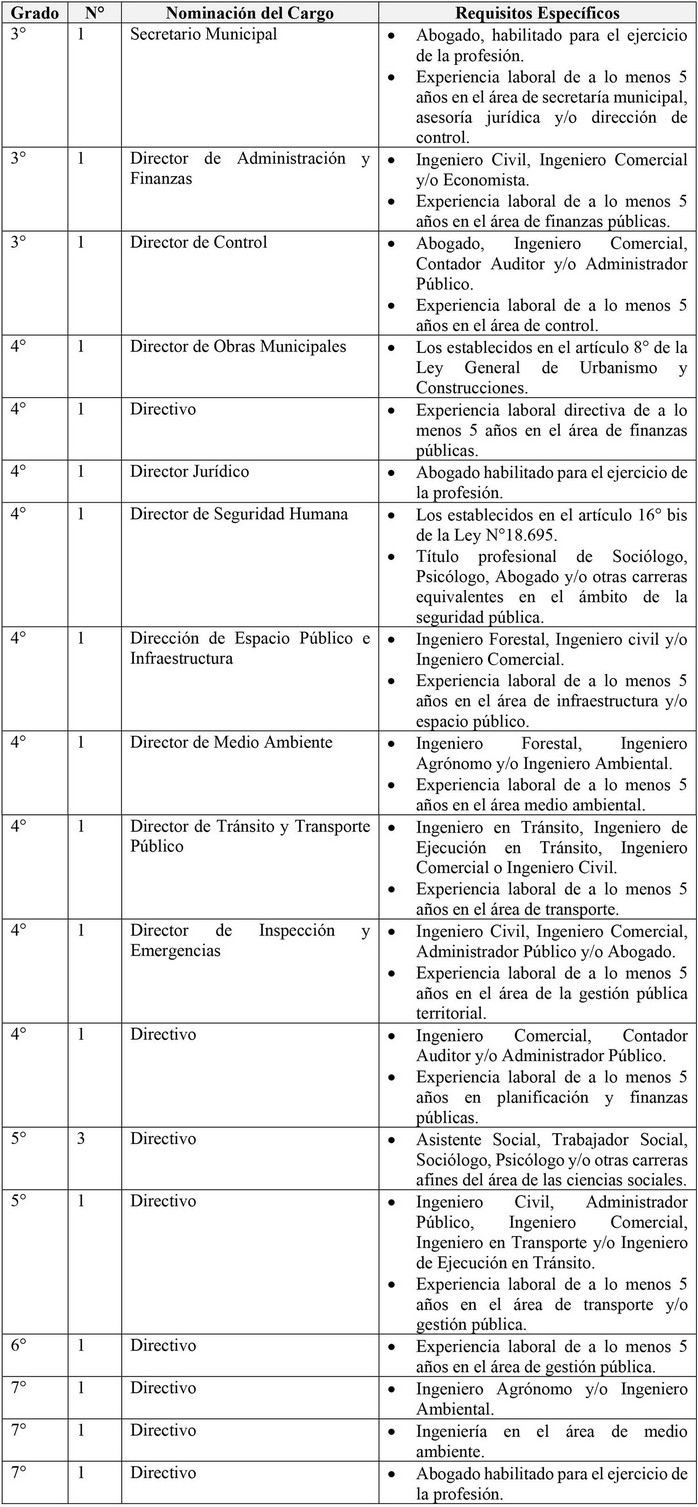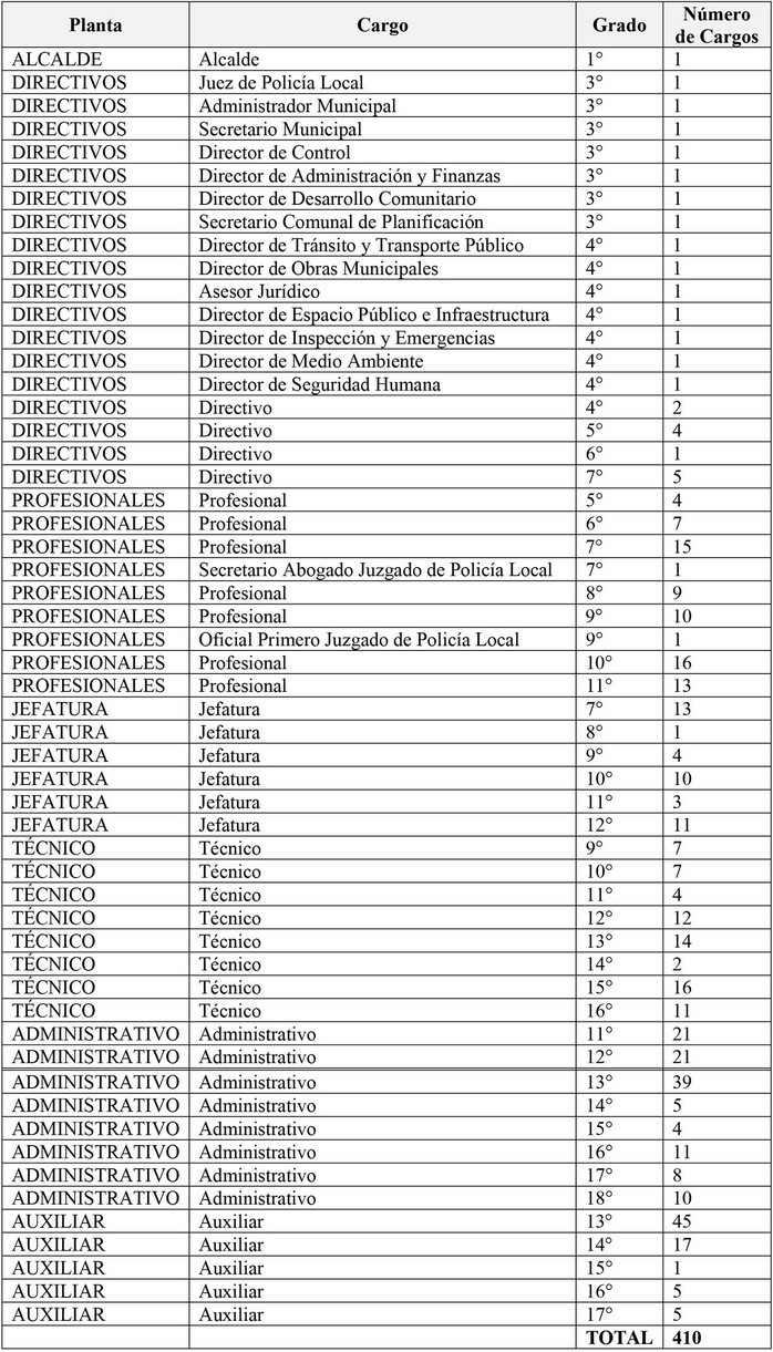 a. Cargo de Administrador Municipal: Creado en virtud del DFL Nº 1-18.695, del Ministerio del Interior, publicado en el Diario Oficial el 27 de febrero de 1993. Este cargo fue modificado posteriormente, en lo referente al grado asignado por el DFL antes citado, por el inciso tercero del artículo 7º de la ley Nº 19.602.