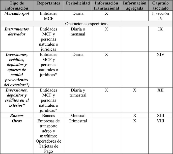 .(*) Las Entidades del MCF reportan estas operaciones diariamente y a nivel transaccional; mientras que las personas naturales o jurídicas lo hacen principalmente a nivel agregado y con frecuencia trimestral, aunque también deben reportar de manera más específica e inmediata aquellas operaciones que realizan directamente mediante la disposición de fondos en el exterior.
