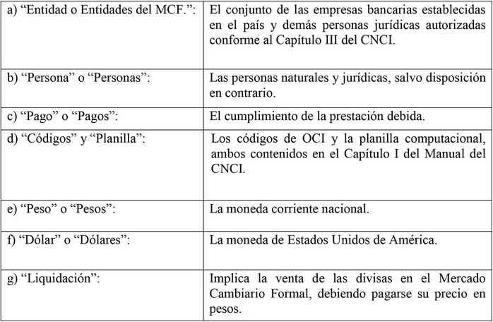Para los efectos del CNCI y de su Manual de Procedimientos y Formularios de Información, cada vez que se utilicen los conceptos o expresiones que se indican, deberá entenderse que ellos se refieren a lo siguiente:
