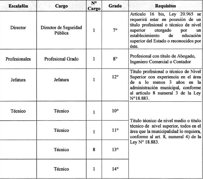 11º.- Que, por decreto de Alcaldía Nº 1.304, de fecha 27 de febrero de 2019, se creó el cargo de Director de Seguridad Pública, luego de haber sido acordado por el Honorable Concejo Municipal en sesión ordinaria Nº 3 de fecha 16 de enero de 2019. El concejo municipal que aprobó este cargo propuesto por el señor alcalde, se encontraba compuesto por los mismos concejales que han concurrido a aprobar el presente Reglamento, dejando constancia en el acta, en que consta la aprobación del Reglamento de Planta, que en aquella oportunidad se consideró especialmente el grado del cargo que se creaba para que este tenga el mismo grado que el de las unidades mínimas, más aún si la persona a elegir debe dar cumplimiento a requisitos preestablecidos. Ahora, si por un lado se considera el nivel de importancia que tiene la seguridad para la comuna la que debe propender a disminuir de manera importante los niveles de inseguridad, a su vez, por otro lado, no es menos importante hacer mención de que los contribuyentes de segundas viviendas pueden llegar a ser muy trascendentes para el presupuesto municipal, en especial por nuevos ingresos por impuesto territorial, patentes, derechos de aseo, permisos de circulación y por tanto exigen altos estándares de seguridad. De igual forma no se puede dejar de señalar que en el artículo 48 de la Ley Nº 18.695, Orgánica Constitucional de Municipalidades y en variada jurisprudencia de la Contraloría General de la República, se ha indicado que a funciones análogas, que importen responsabilidades semejantes y se ejerzan en condiciones similares, se les asignen iguales retribuciones y demás beneficios económicos.