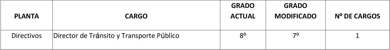 7. Que, en relación con la propuesta de cambio de grado de quien ejerza la Dirección de Tránsito y Transporte Público, las responsabilidades han ido en aumento por las causas ya extendidamente señaladas, pasando Curanilahue, de ser una comuna semi rural en la periferia de la ciudad, en la época en que se fijó la actual posición jerárquica de la Dirección (año 1994), a ser una comuna plenamente urbana e inserta en la red vial más importante de la ciudad, debiendo efectuar labores de supervigilancia tanto de la Ley de Tránsito como de la ejecución de proyectos viales y junto con ello, revisar estudios de accesibilidad (análisis vial básico) y estudios de impacto sobre el sistema de transporte urbano (EISTU) proponiendo las observaciones y/o medidas de mitigación al sistema de ventanilla única, del Ministerio de Transportes y Telecomunicaciones, habiéndose por tanto elevado considerablemente la complejidad del quehacer de dicha Dirección. Adicionalmente, el aumento de grado del Director de Tránsito y Transporte Público obedece a la necesidad de satisfacer la demanda de los vecinos y usuarios de la Municipalidad quienes contribuyen económicamente a una de las fuentes generadoras de ingresos en la comuna, como lo son licencias de conducir y permisos de circulación. Así, dada su relevancia resulta dable aumentar el grado del director, dada las funciones establecidas por ley, en cumplimiento del artículo 26º de la ley Nº 18.695, Orgánica Constitucional de Municipalidades