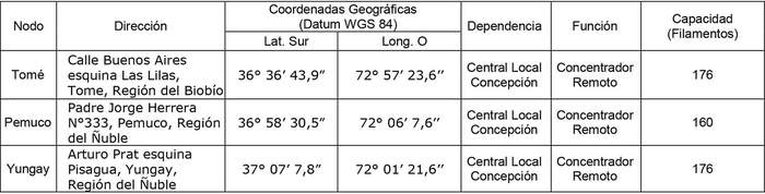 Los concentradores telefónicos remotos que se instalarán en las localidades de Tomé, en la Región del Biobío; Pemuco y Yungay, en la Región de Ñuble, estarán interconectados con las empresas locales, móviles y portadores, que operan en la zona, a través de las interconexiones, debidamente autorizadas, que posee Telefónica del Sur en la ciudad de Concepción.