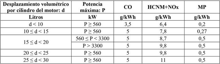 Tabla II-5: Límites máximos de emisión provenientes del sistema de escape en gramos por kilowatt hora (g/kWh), para desplazamiento volumétrico por cilindro del motor (d) menor a 30 litros.