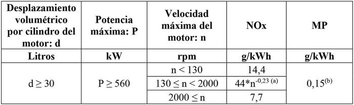 Tabla II-3: Límites máximos de emisión provenientes del sistema de escape en gramos por kilowatt hora (g/kWh), para desplazamiento volumétrico por cilindro del motor (d) mayor o igual a 30 litros.