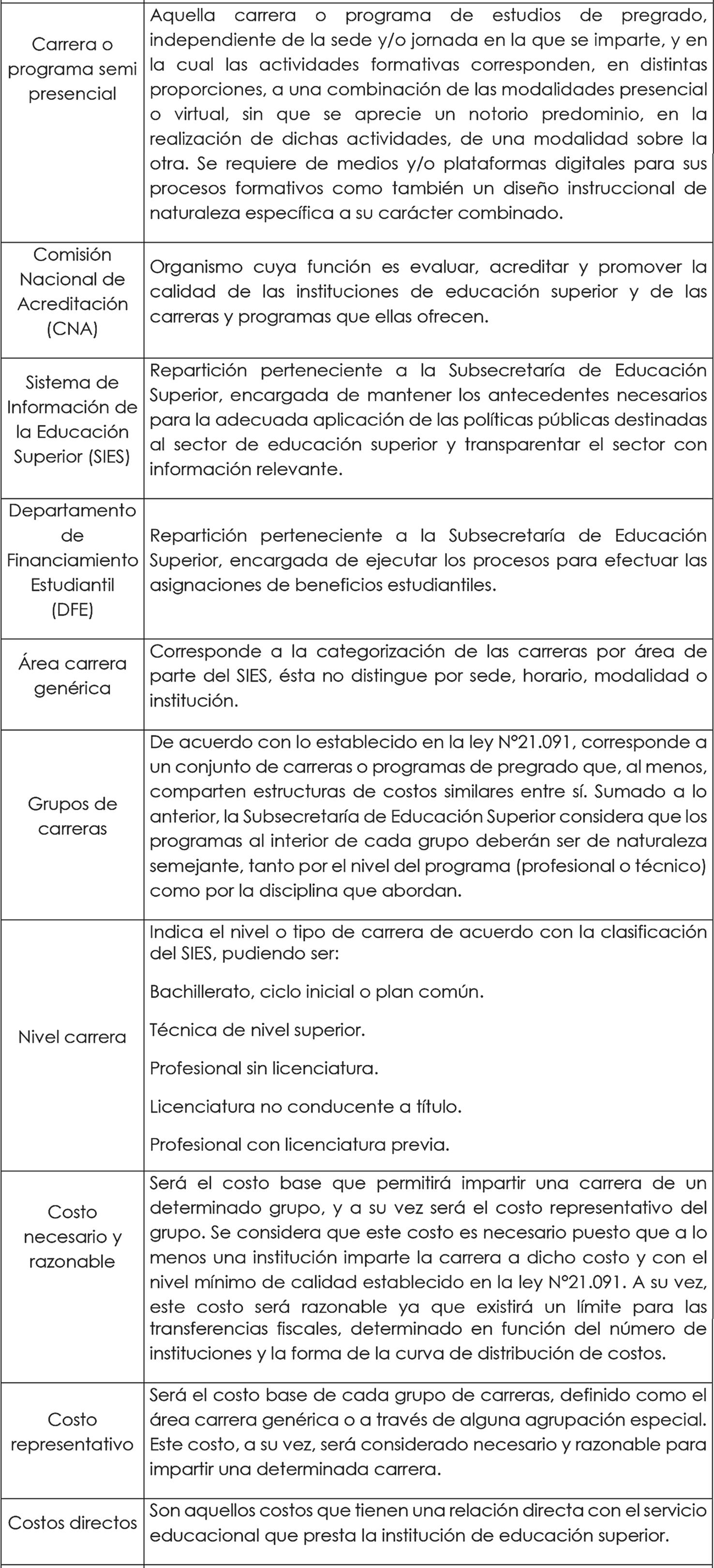 El legislador dispuso que el cálculo de los valores en comento se realizará en base a "grupos de carreras", los que serán definidos por la Subsecretaría. Así, los "grupos de carrera" corresponderán a conjuntos de carreras o programas de estudios que tengan estructura de costos similares entre sí. Para ello, la Subsecretaría deberá considerar, al menos: