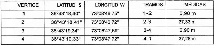 Decreto supremo N° 114, del 3 de marzo 2020, del Ministerio de Defensa Nacional, Subsecretaría para las Fuerzas Armadas, otorgó a Essbio S.A., Rut 76.833.300-9, primera renovación con modificación de concesión marítima menor, con vencimiento el 31 de diciembre 2024, sobre un sector de playa, en el lugar denominado Tumbes, Bahía de San Vicente, comuna de Talcahuano, provincia de Concepción, Región del Biobío, con una superficie total de 33,57 m2, la que fue tramitada con el SIABC N° 42.340. A modo referencial se señala la(s) siguiente(s) coordenada(s) geográfica(s):