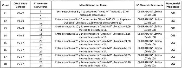 En su recorrido, el proyecto "Línea eléctrica 1x66 kV Pangueco - Duqueco" afectará las líneas eléctricas que se indican a continuación: