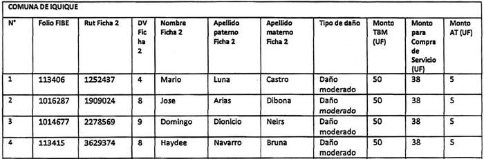 1. Asígnase directamente un subsidio del Programa de Mejoramiento de Viviendas y Barrios, regulado por el DS N° 27 (V. y U.), de 2016, correspondiente al capítulo segundo, mejoramiento de la vivienda, modalidad banco de materiales, destinado al financiamiento para la adquisición de materiales de construcción, a 194 familias de la comuna de Iquique, Alto Hospicio, Pozo Almonte y Huara, cuyas viviendas resultaron evaluadas con diferentes tipos de daños como consecuencia de las intensas lluvias estivales que afectaron a la Región de Tarapacá en el mes de febrero de 2019, las que se detallan a continuación y por los montos allí señalados.