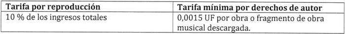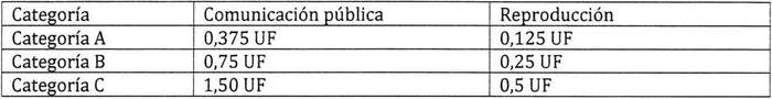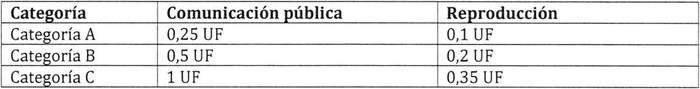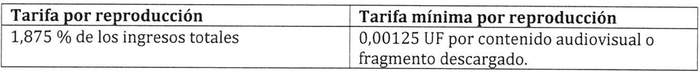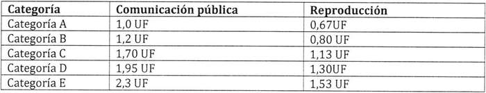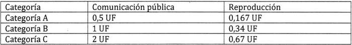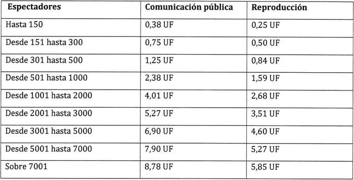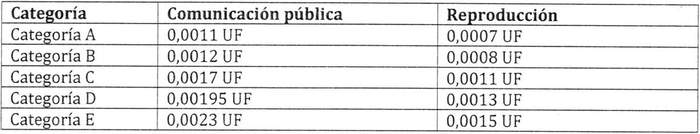 Los servicios que no tengan suscriptores o sus suscriptores mensuales sean menores o iguales a 500 estarán sujetos a una tarifa mínima mensual de 3,25 UF por comunicación pública y de 2,17 UF por reproducción.