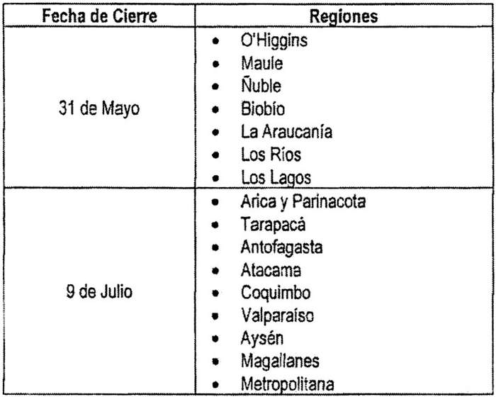 En tal sentido, se efectuarán dos cierres para la presentación de proyectos, de acuerdo a la siguiente distribución regional: