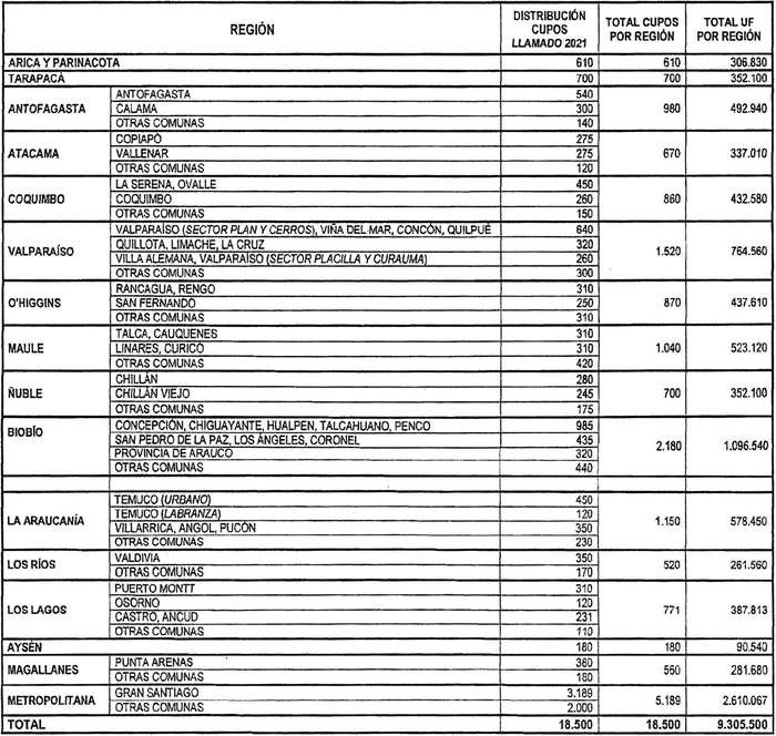 La cantidad de cupos de subsidio y recursos que se dispondrán para este llamado son los que se señalan a continuación: