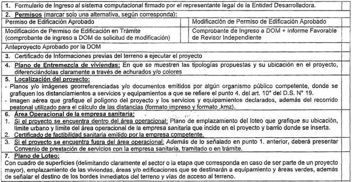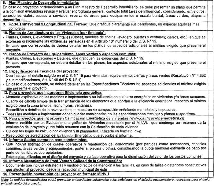 Se efectuará de acuerdo a lo señalado en los artículos 12º y 13º del DS Nº 19 (V. y U.), de 2016. Todos los proyectos deberán cumplir con las condiciones, exigencias y requisitos establecidos en el referido DS Nº 19 y en esta resolución.