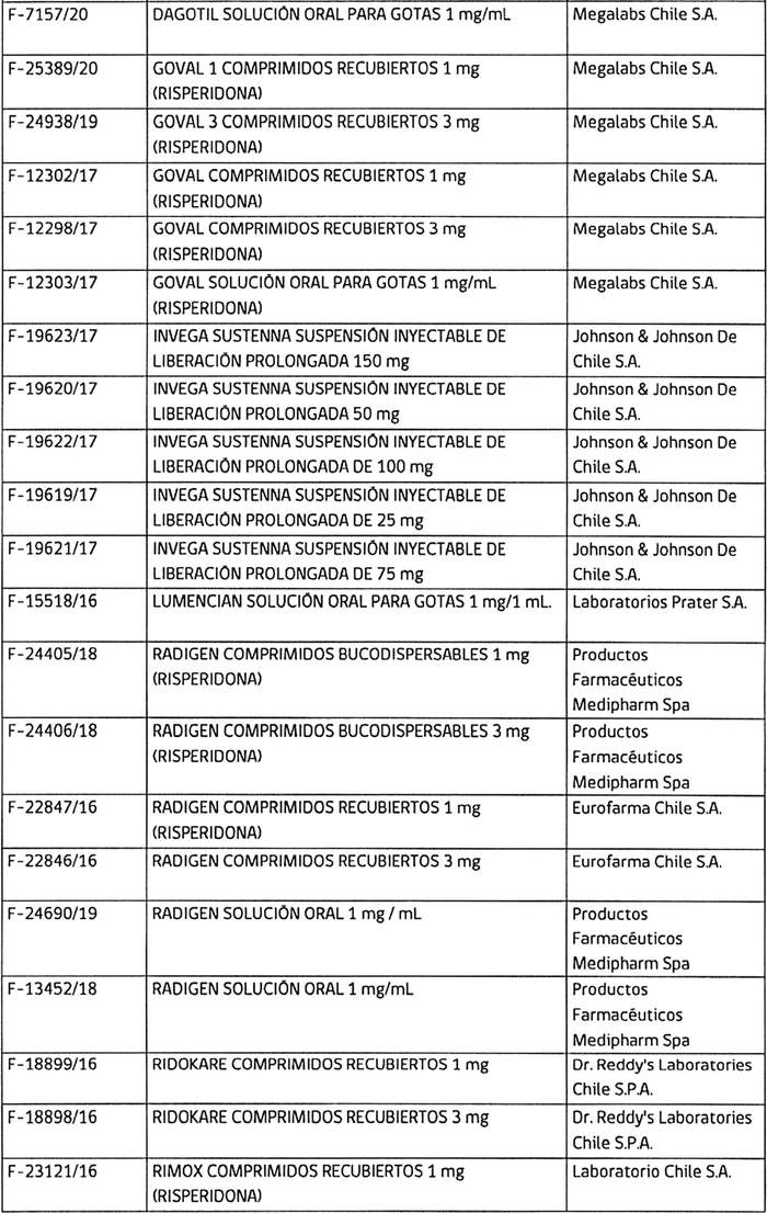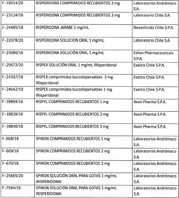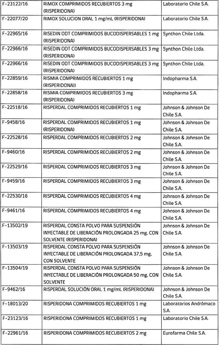 1. Que, risperidona es un medicamento antipsicótico, frecuentemente usado en el tratamiento de cuadros psiquiátricos, existiendo, a nivel nacional, un elevado número de productos farmacéuticos (66 registros sanitarios) que lo contienen;