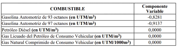 1.- Determínanse los siguientes componentes variables de los impuestos específicos establecidos en la Ley N° 18.502, que Establece impuestos a los combustibles que señala, en virtud de lo señalado en el artículo 3 de la ley N° 20.765: