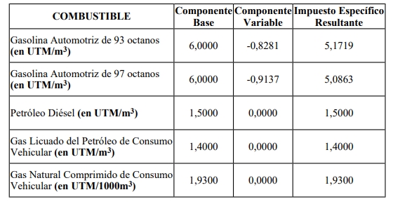 3.- Determínanse, como consecuencia de lo anterior, las tasas de los Impuestos Específicos de los Combustibles establecidos en la ley N° 18.502, los cuales serán iguales a su componente base, considerando además el componente variable, que puede ser sumado o restado según lo previsto en el artículo 3 de la ley N° 20.765,  y lo dispuesto en el artículo 8 de su Reglamento.