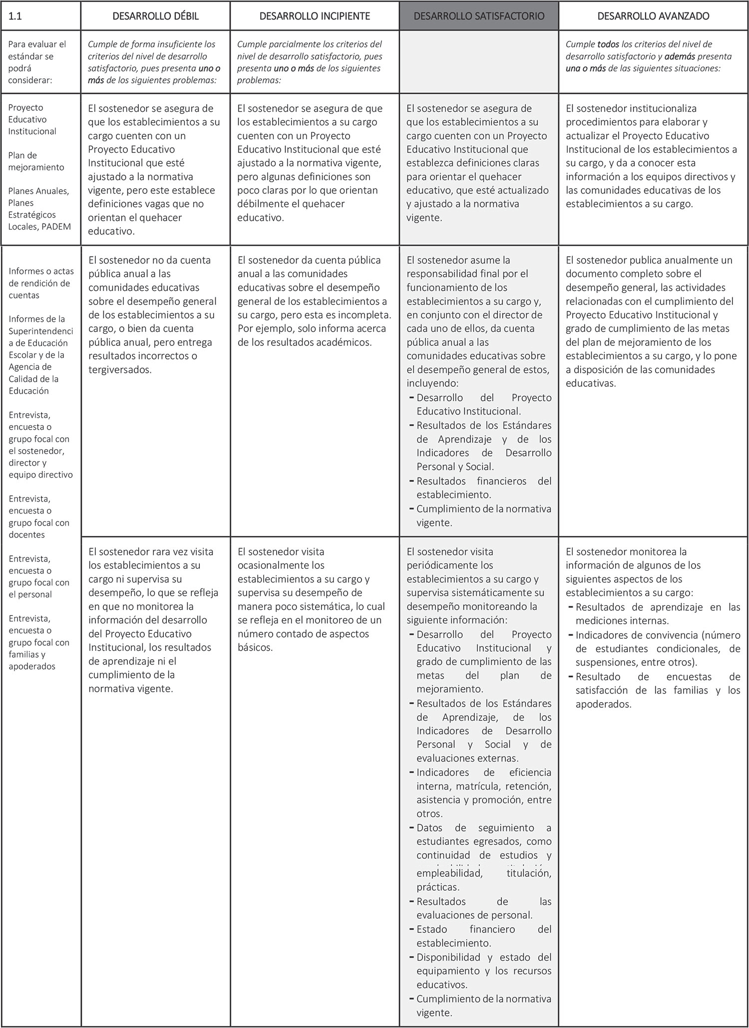 Estándar 1.1: El sostenedor se responsabiliza por el desarrollo del Proyecto Educativo Institucional, el desempeño y el cumplimiento de la normativa vigente de los establecimientos a su cargo.