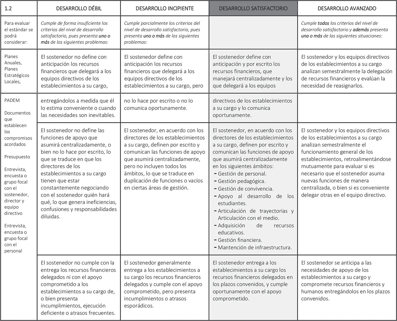 Estándar 1.2: El sostenedor define formalmente las funciones que asumirá centralizadamente y aquellas que delegará a los equipos directivos de los establecimientos a su cargo, y cumple con sus compromisos.(1)