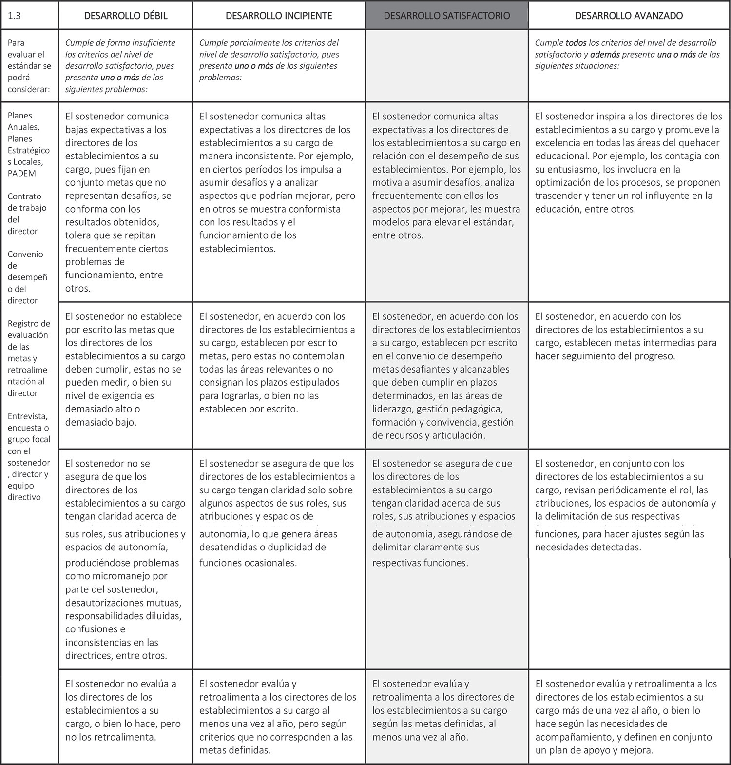 Estándar 1.3: El sostenedor comunica altas expectativas a los directores de los establecimientos a su cargo, les establece metas desafiantes, clarifica sus atribuciones y evalúa su desempeño.