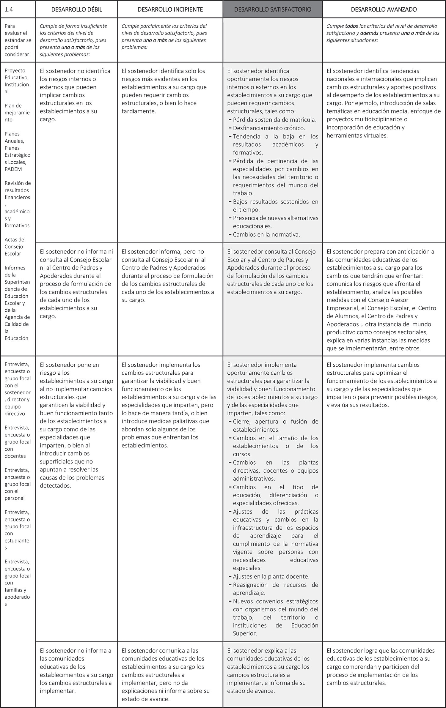 Estándar 1.4: El sostenedor introduce, de manera oportuna, los cambios estructurales necesarios para asegurar la viabilidad y buen funcionamiento de los establecimientos a su cargo y de las especialidades que imparten.