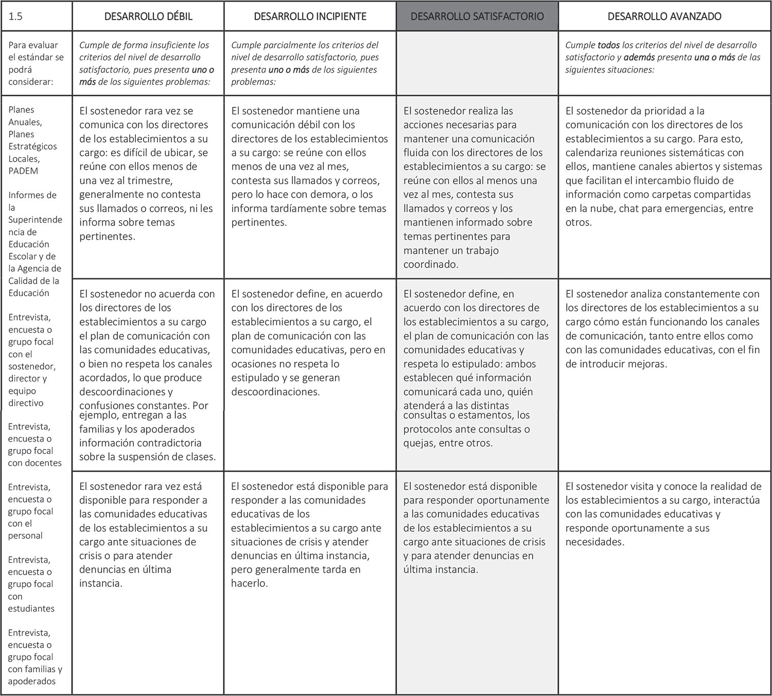 Estándar 1.5: El sostenedor genera canales fluidos de comunicación con los directores y las comunidades educativas de los establecimientos a su cargo, y con las instituciones del Estado pertinentes.