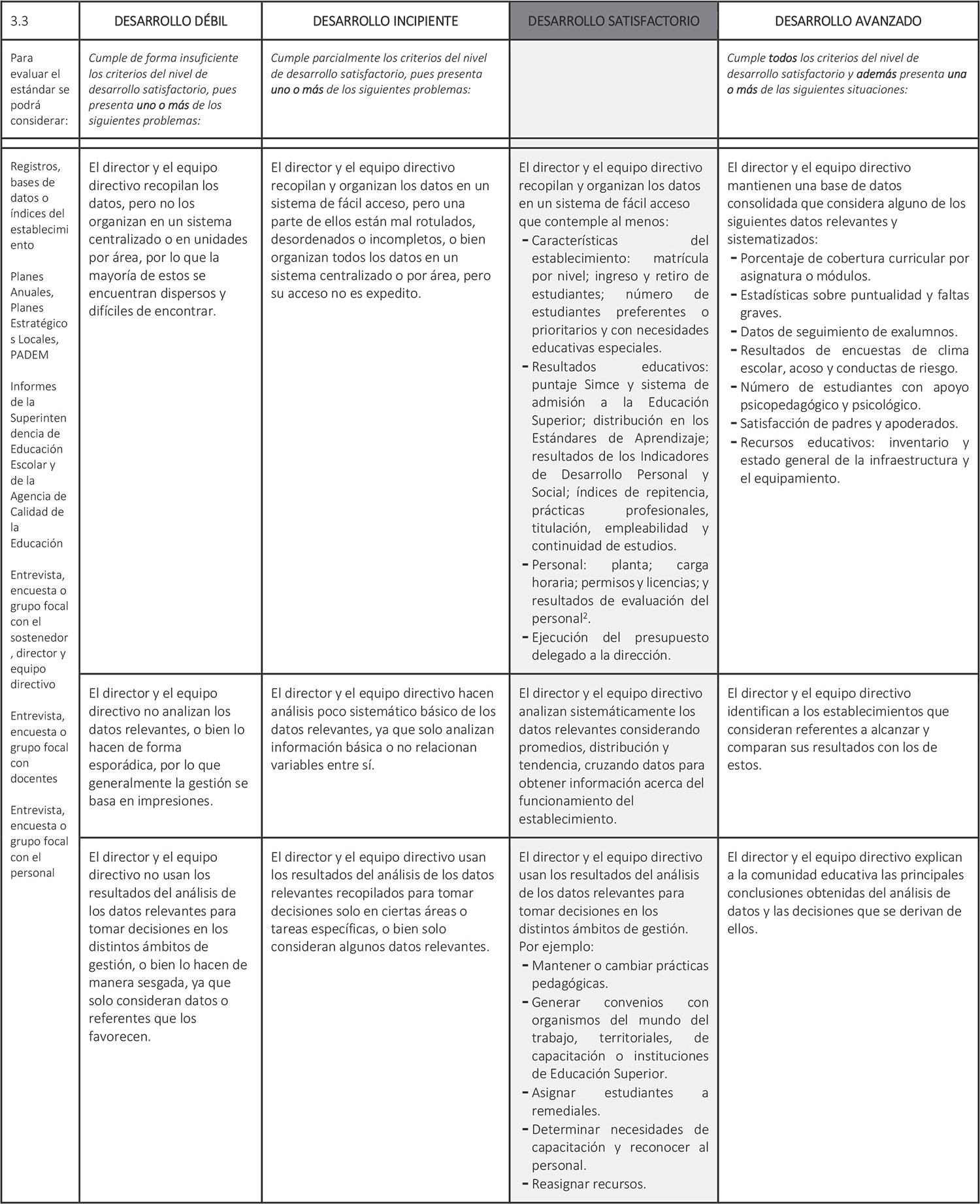 Estándar 3.3: El director y el equipo directivo sistematizan continuamente los datos relevantes de la gestión escolar y los utilizan para tomar decisiones.