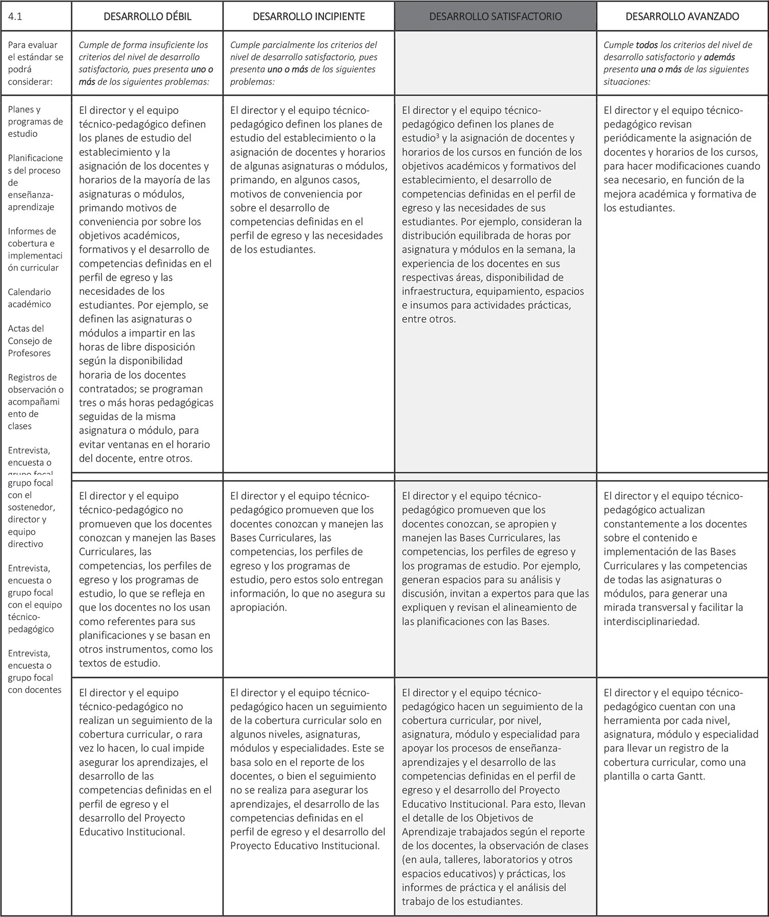 Estándar 4.1: El director y el equipo técnico-pedagógico coordinan la implementación efectiva y contextualizada de las Bases Curriculares y los programas de estudio para el desarrollo de competencias definidas en el perfil de egreso de sus estudiantes.
