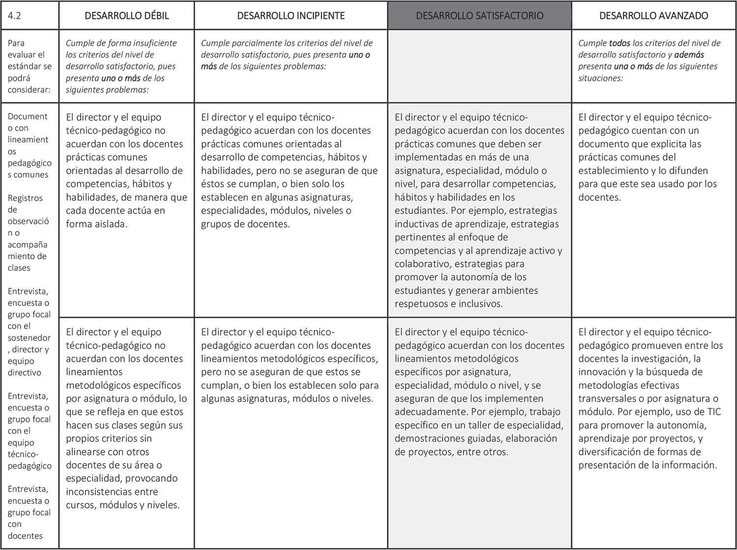 Estándar 4.2: El director y el equipo técnico-pedagógico acuerdan con los docentes lineamientos pedagógicos comunes para la implementación efectiva del currículum y el desarrollo de competencias definidas en el perfil de egreso de sus estudiantes.