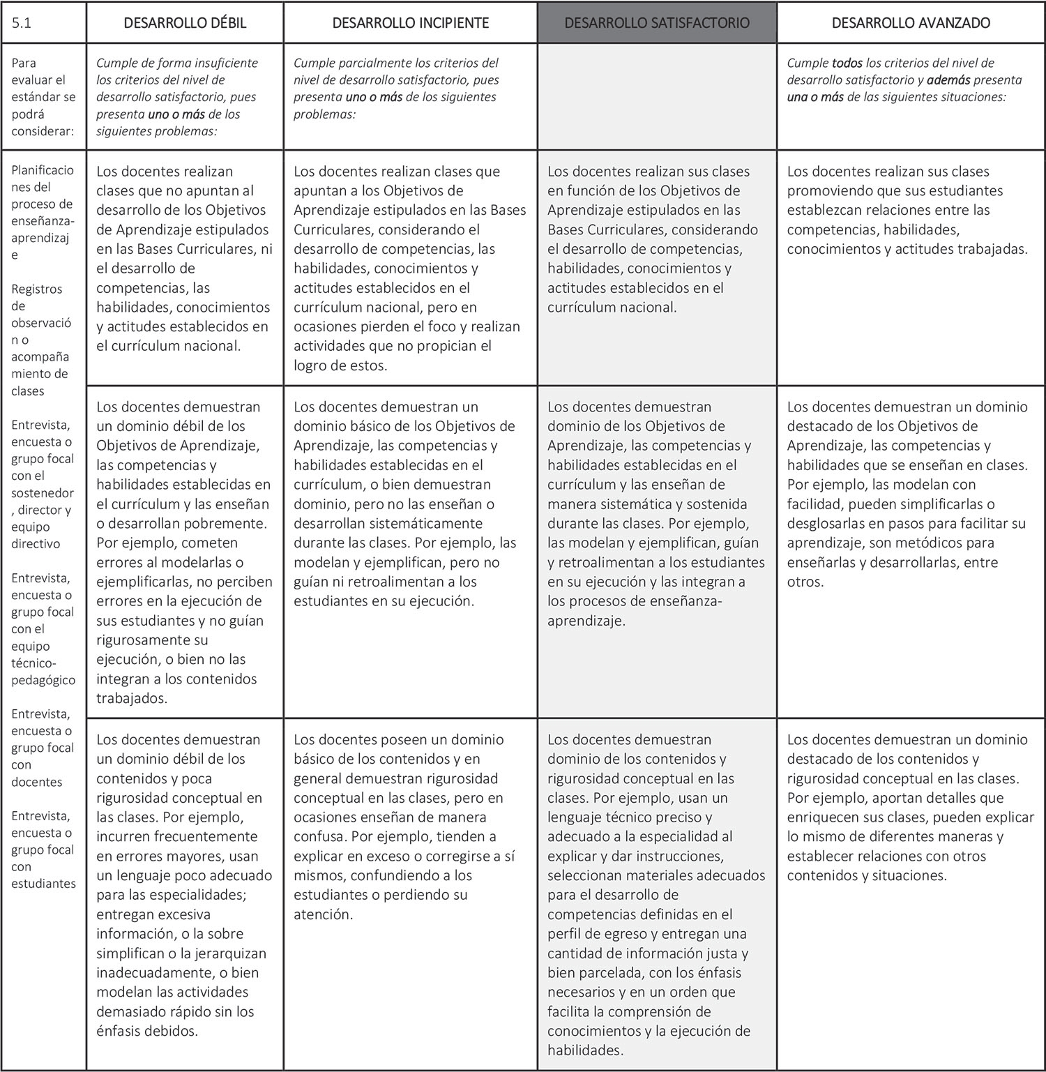 Estándar 5.1: Los docentes centran sus clases en los Objetivos de Aprendizaje estipulados en las Bases Curriculares, con un manejo riguroso de las competencias, habilidades, contenidos y actitudes a desarrollar.