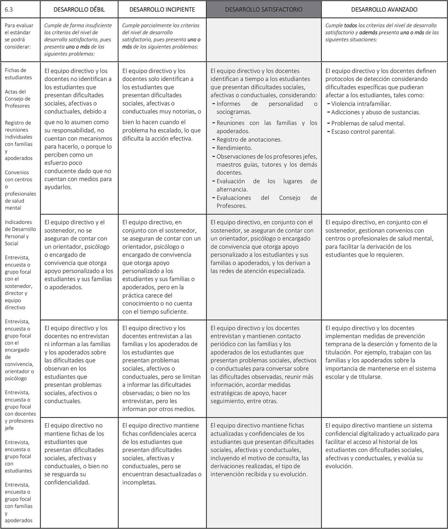 Estándar 6.3: El equipo directivo y los docentes identifican a tiempo a los estudiantes que presentan dificultades sociales, afectivas y conductuales, e implementan medidas efectivas para apoyarlos.