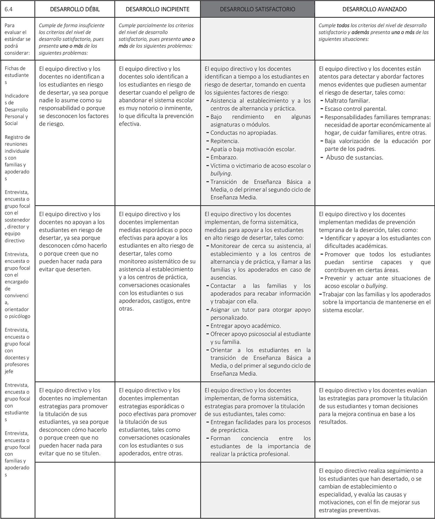 Estándar 6.4: El equipo directivo y los docentes implementan estrategias efectivas para evitar la deserción escolar y promover la titulación.