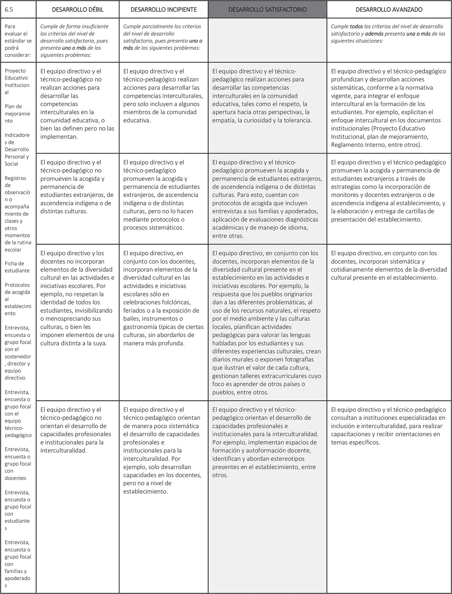 Estándar 6.5: El equipo directivo y el técnico-pedagógico incorporan un enfoque inclusivo e intercultural para asegurar el desarrollo de los estudiantes de distintas culturas.