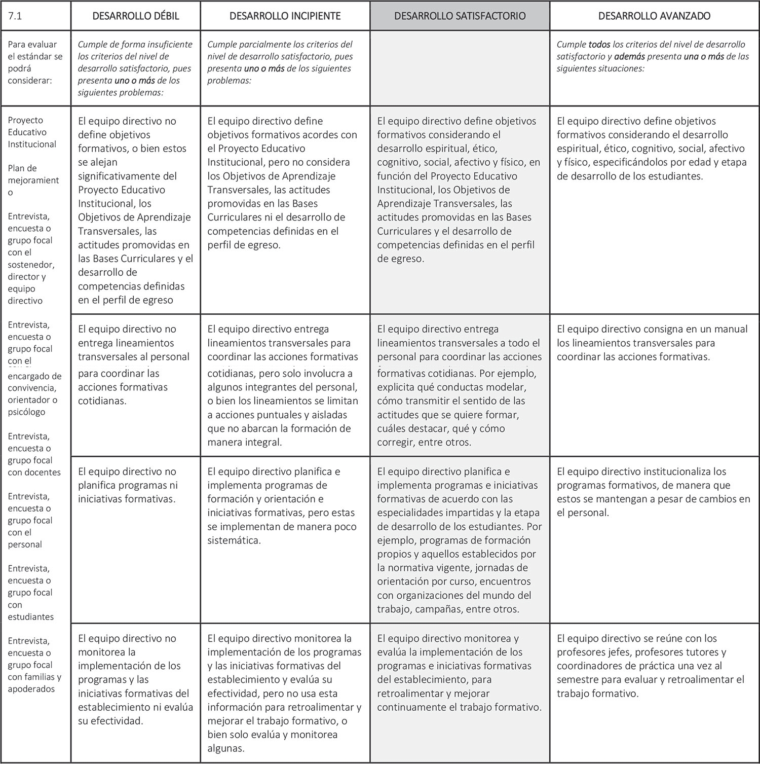 Estándar 7.1: El equipo directivo planifica, implementa y monitorea programas e iniciativas para la formación integral de sus estudiantes de acuerdo con el Proyecto Educativo Institucional.