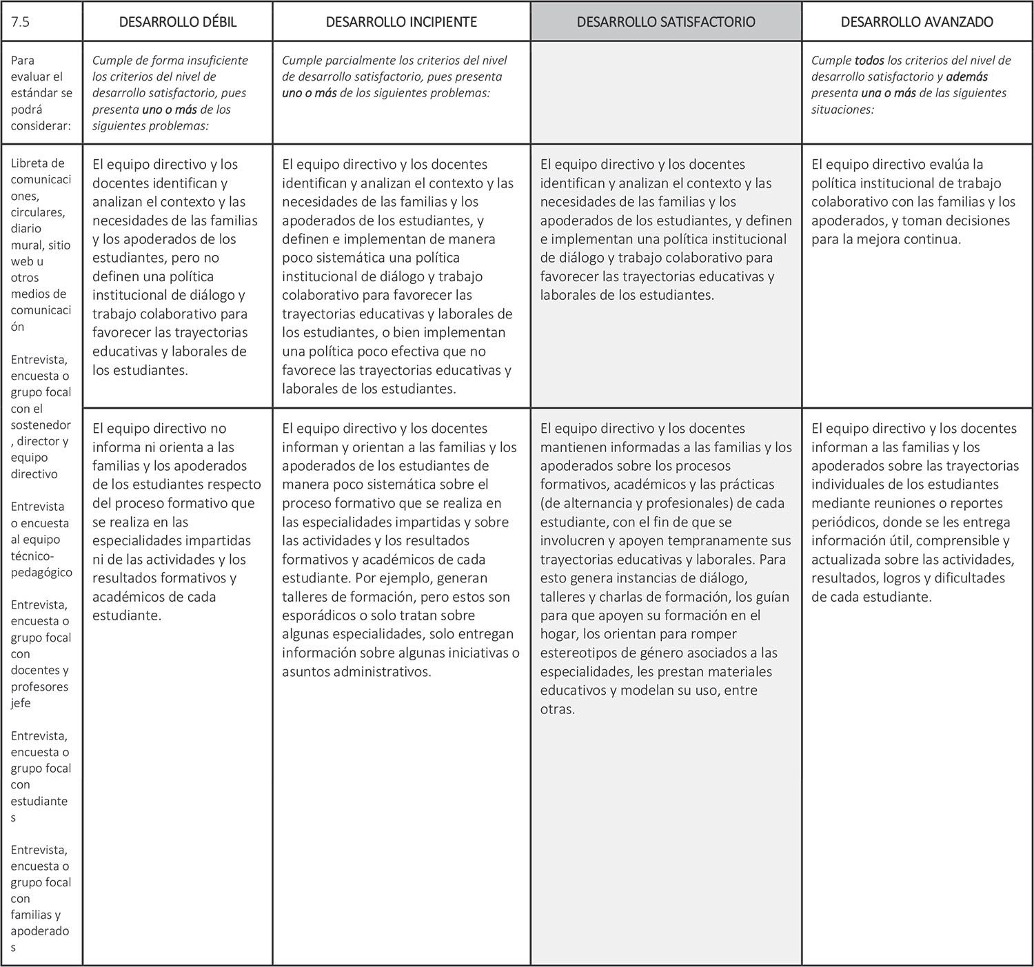 Estándar 7.5: El equipo directivo y los docentes trabajan de forma colaborativa con las familias y los apoderados para favorecer las trayectorias educativas y laborales de los estudiantes.