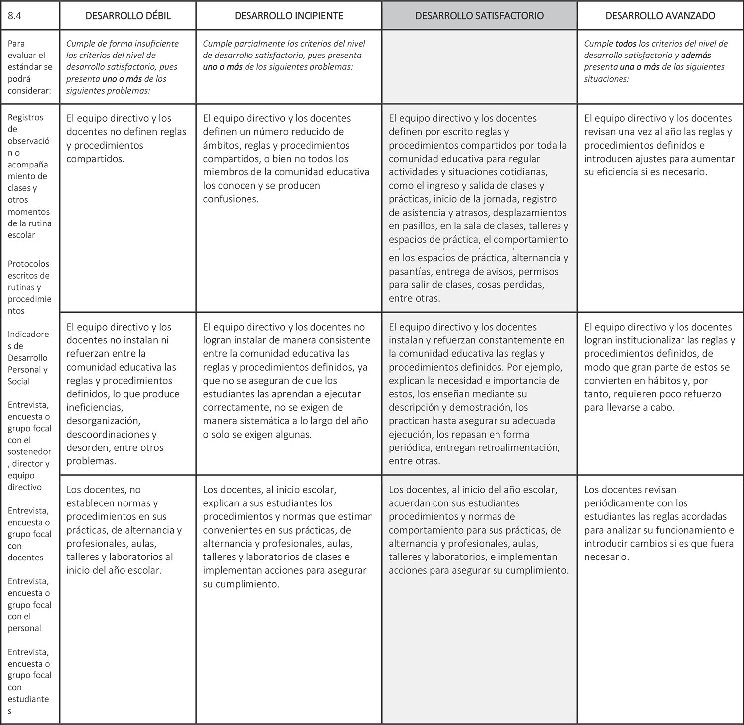 Estándar 8.4: El equipo directivo y los docentes acuerdan reglas y procedimientos para facilitar el desarrollo de las actividades pedagógicas y las prácticas.
