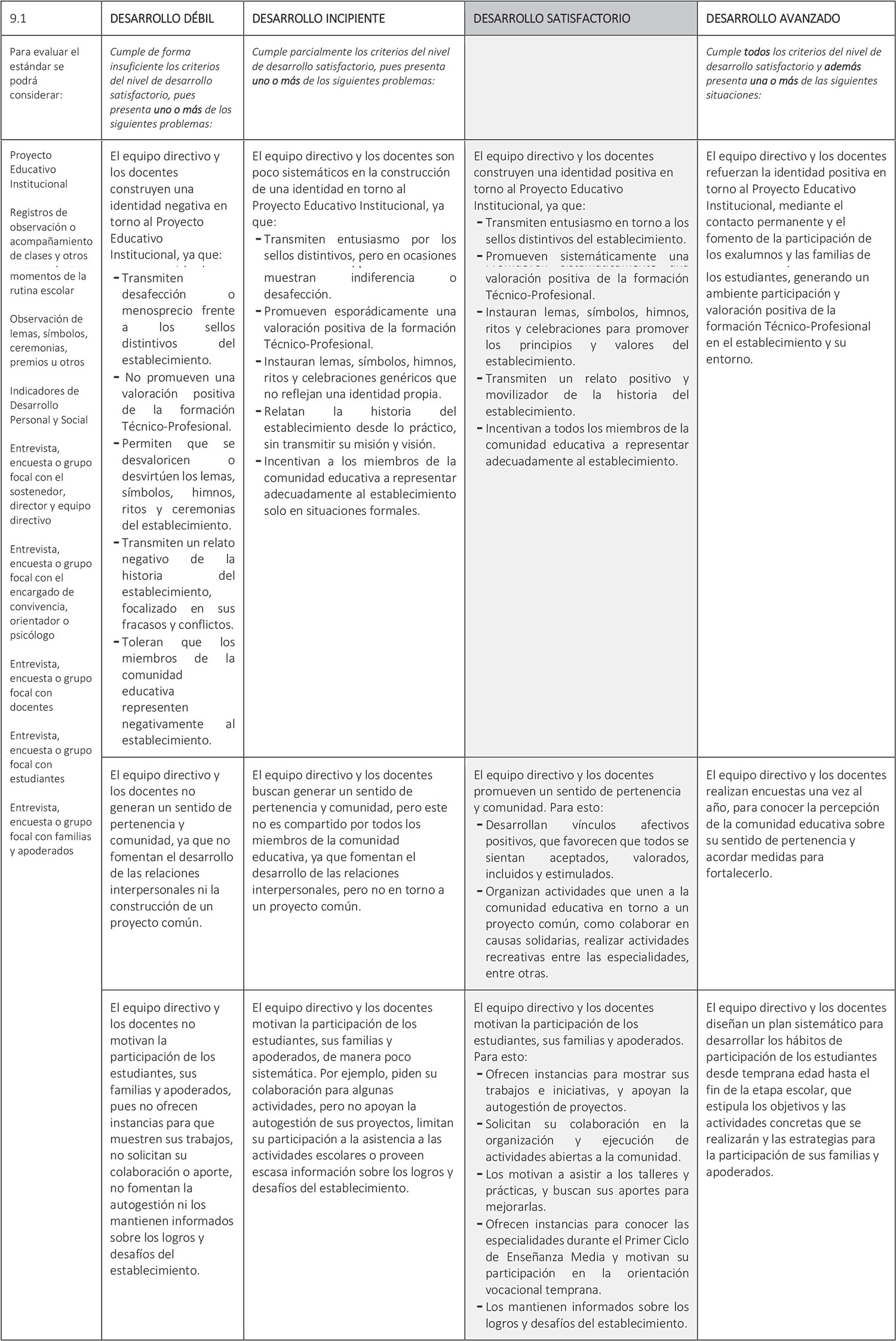 Estándar 9.1: El equipo directivo y los docentes promueven el sentido de pertenencia y participación en torno al Proyecto Educativo Institucional.
