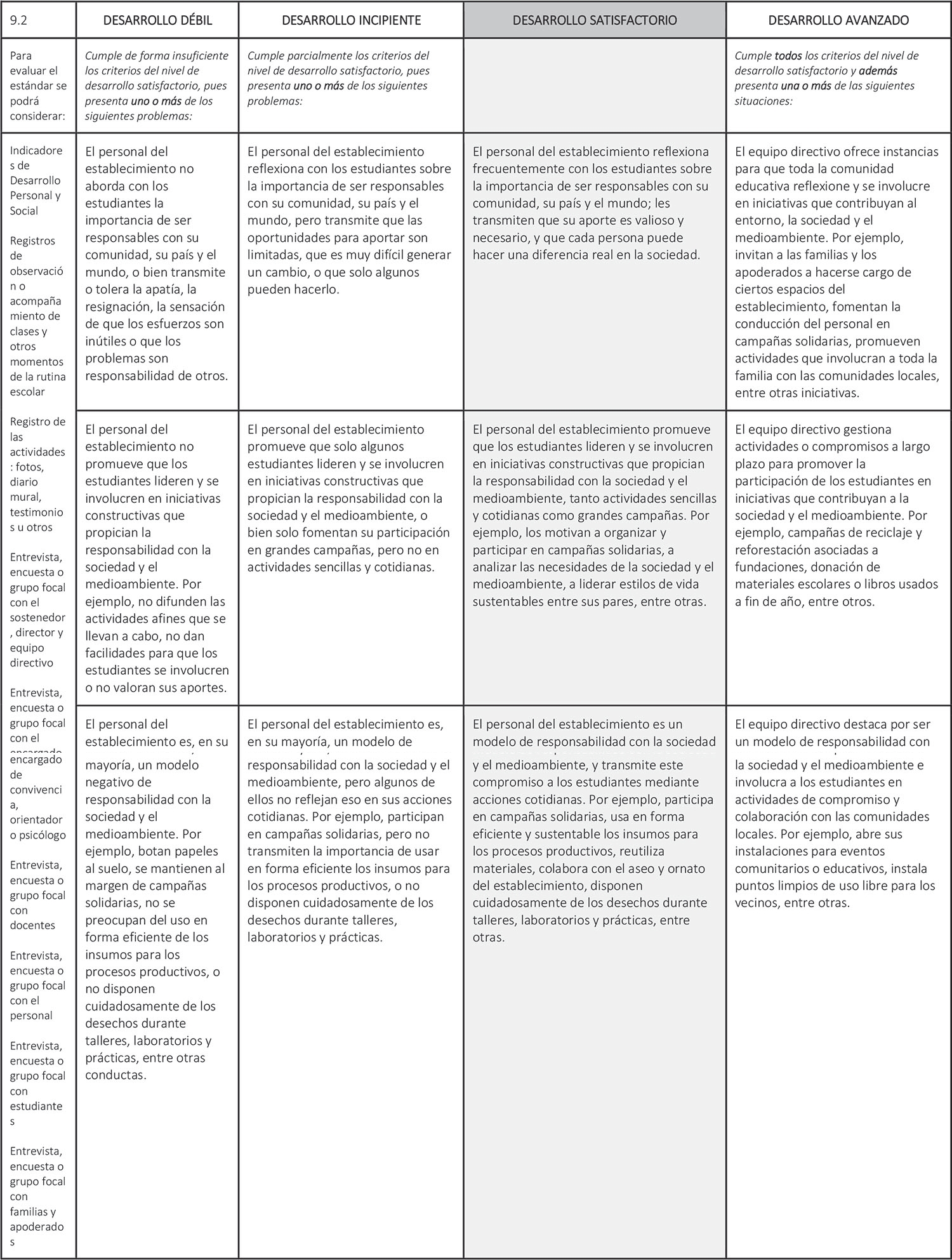 Estándar 9.2: El personal del establecimiento promueve entre los estudiantes un sentido de responsabilidad con la sociedad y el medio ambiente, y los motivan a realizar aportes concretos.