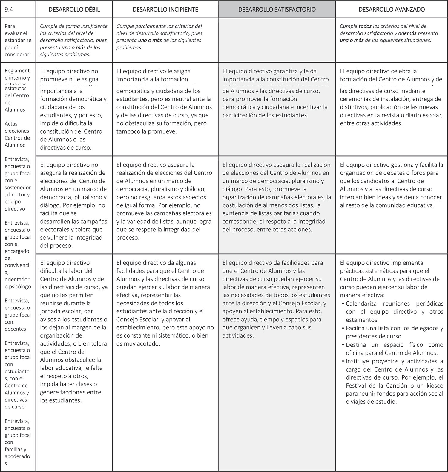 Estándar 9.4: El equipo directivo promueve la formación democrática y ciudadana, y la participación activa de los estudiantes mediante el apoyo al Centro de Alumnos y a las directivas de curso.