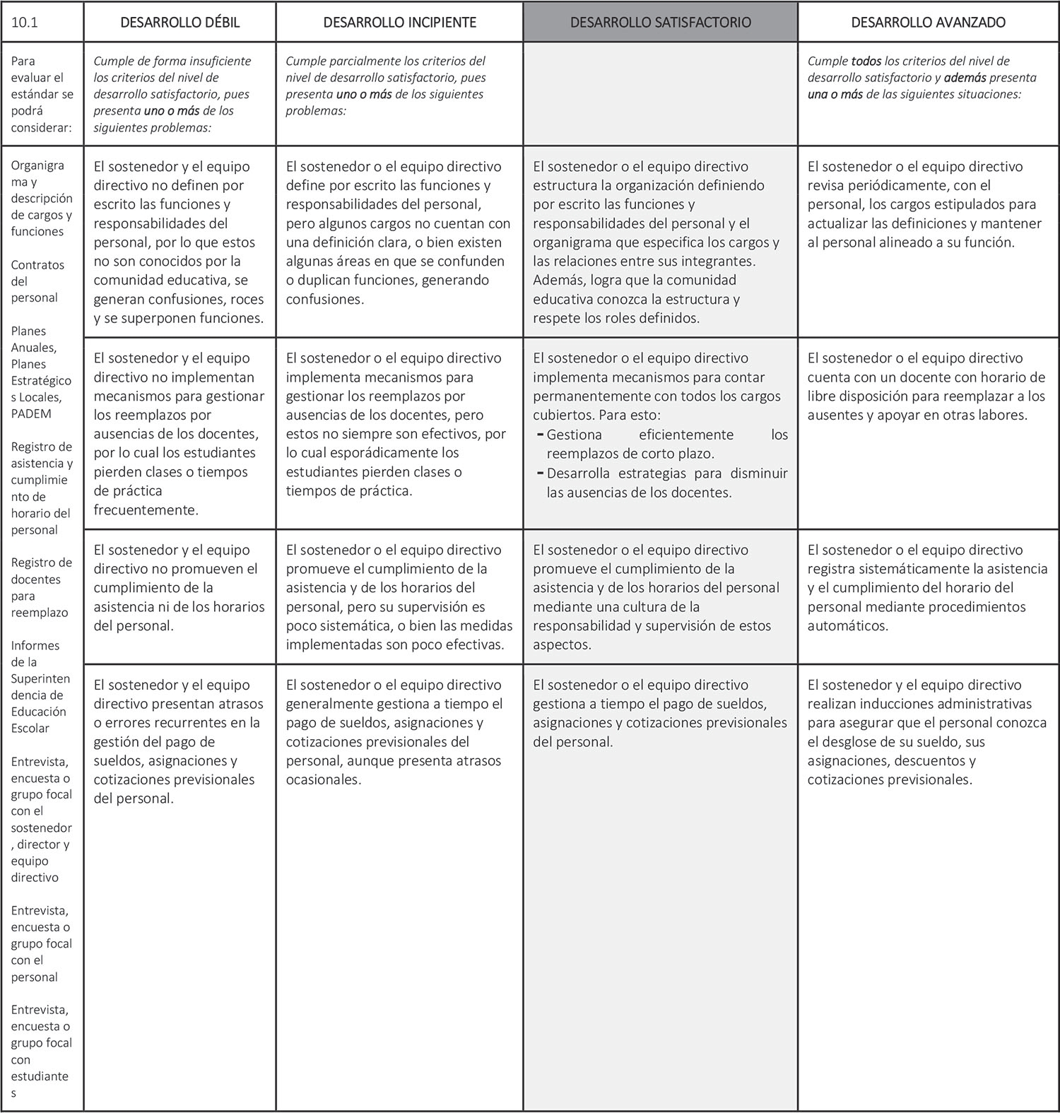 Estándar 10.1: El sostenedor o el equipo directivo organiza y maneja de manera efectiva los aspectos administrativos del personal.