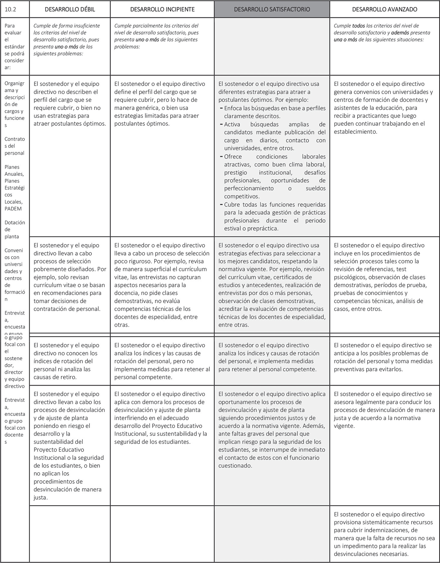 Estándar 10.2: El sostenedor o el equipo directivo implementa estrategias efectivas para contar con personal idóneo y competente.