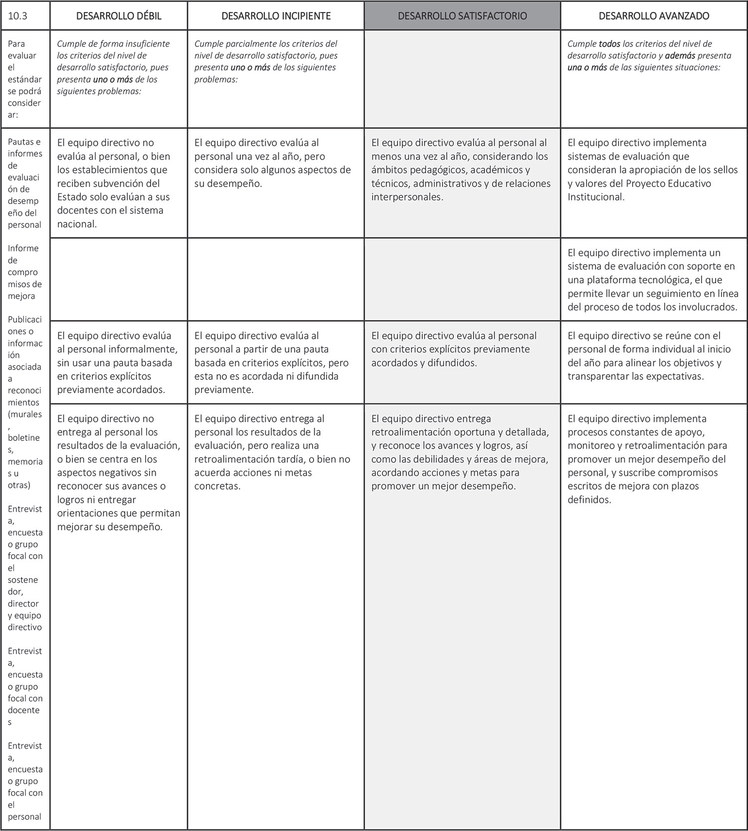 Estándar 10.3: El equipo directivo implementa un sistema de evaluación y retroalimentación del desempeño del personal.