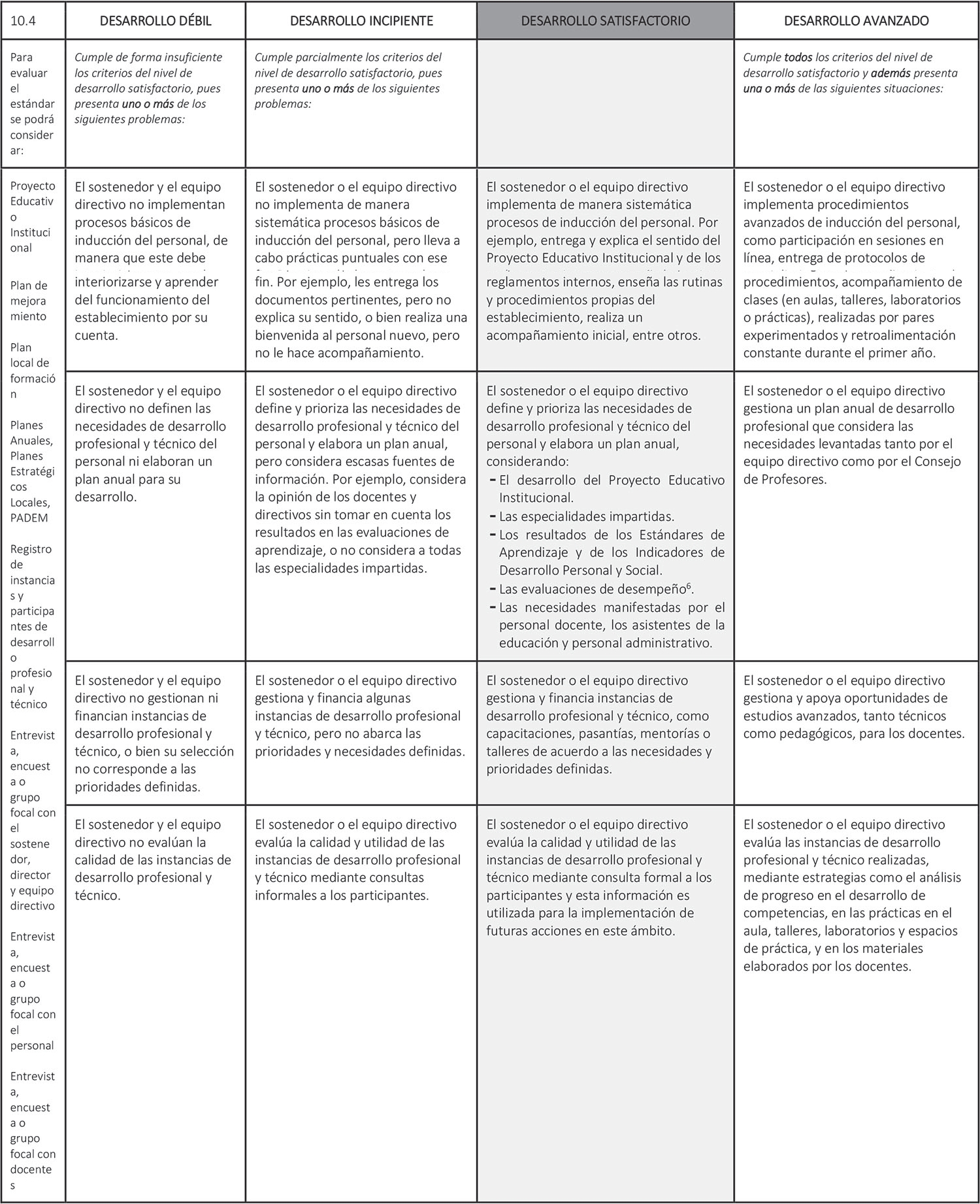 Estándar 10.4: El sostenedor o el equipo directivo gestiona el desarrollo profesional y técnico del personal según las necesidades pedagógicas y administrativas del establecimiento.