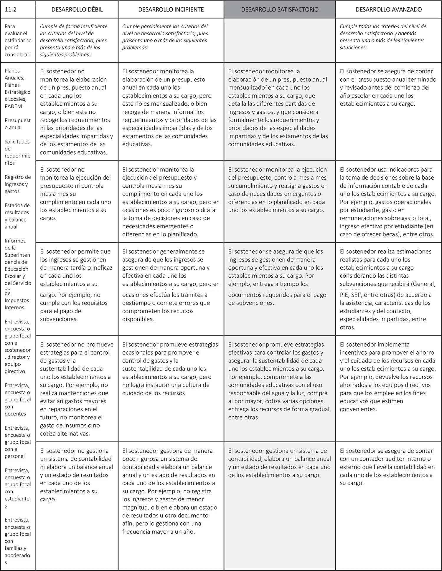 Estándar 11.2: El sostenedor asegura la sustentabilidad del Proyecto Educativo Institucional de los establecimientos a su cargo, rigiéndose por un presupuesto, controlando los gastos y rindiendo cuenta del uso de los recursos.