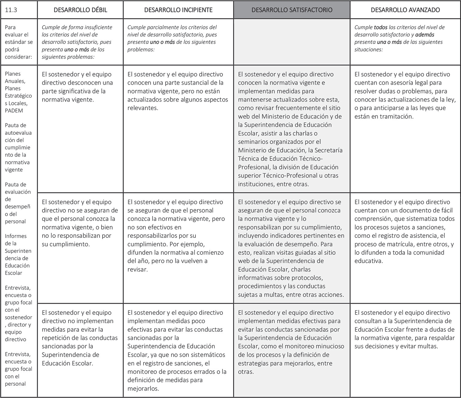 Estándar 11.3: El sostenedor y el equipo directivo se aseguran de cumplir con la normativa vigente.