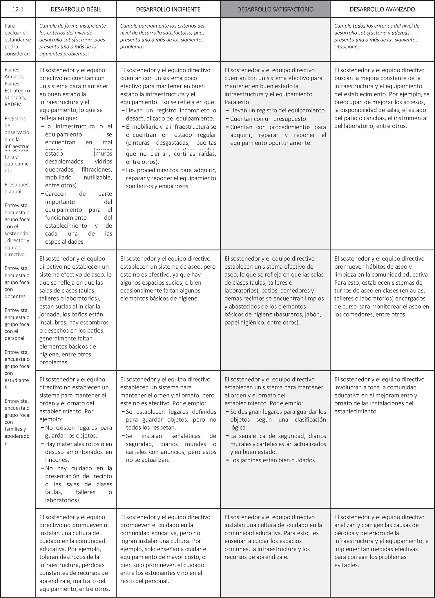 Estándar 12.1: El sostenedor y el equipo directivo se aseguran de mantener la infraestructura y el equipamiento en buen estado para el funcionamiento del establecimiento y de las especialidades que imparten.
