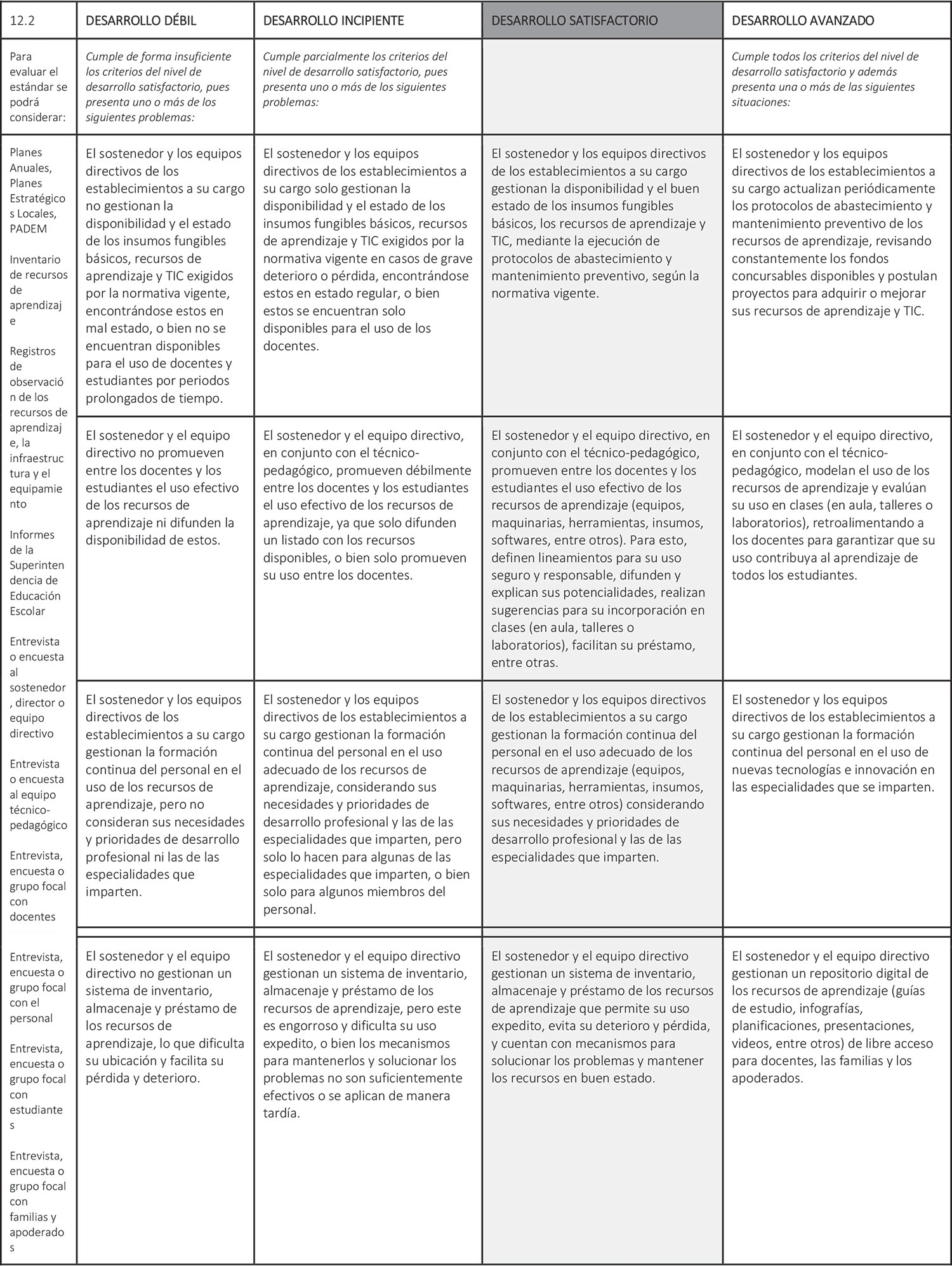 Estándar 12.2: El sostenedor y los equipos directivos de los establecimientos a su cargo gestionan la disponibilidad, el estado y el uso de recursos de aprendizaje para la implementación de cada especialidad.