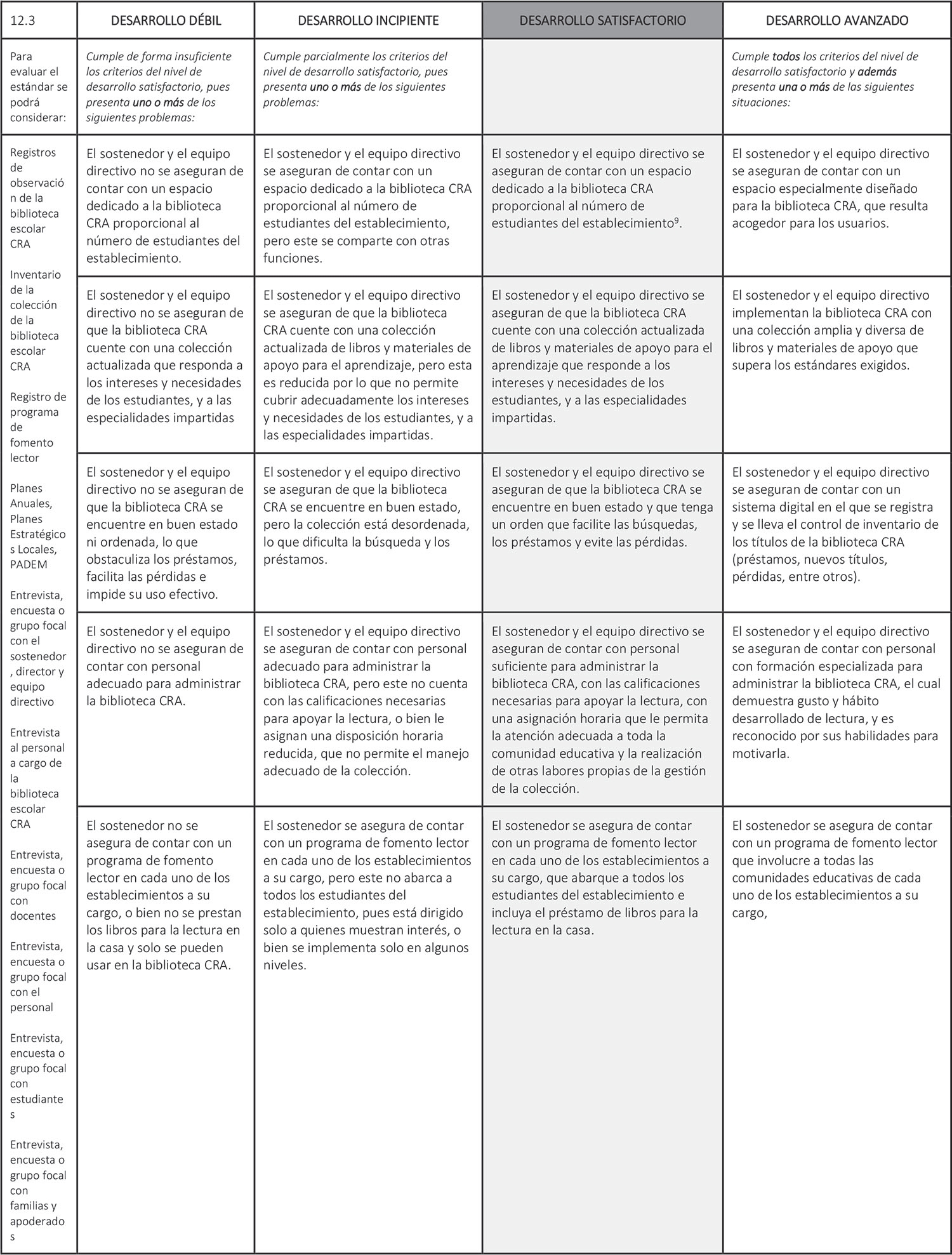 Estándar 12.3: El sostenedor y el equipo directivo se aseguran de contar con una biblioteca escolar CRA(8) para apoyar el aprendizaje de los estudiantes y fomentar el hábito lector.