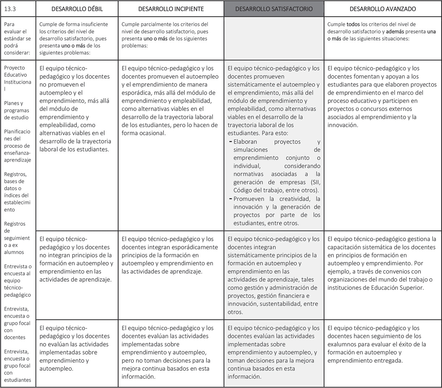 Estándar 13.3: El equipo técnico-pedagógico y los docentes implementan estrategias para formar a los estudiantes en autoempleo y emprendimiento.