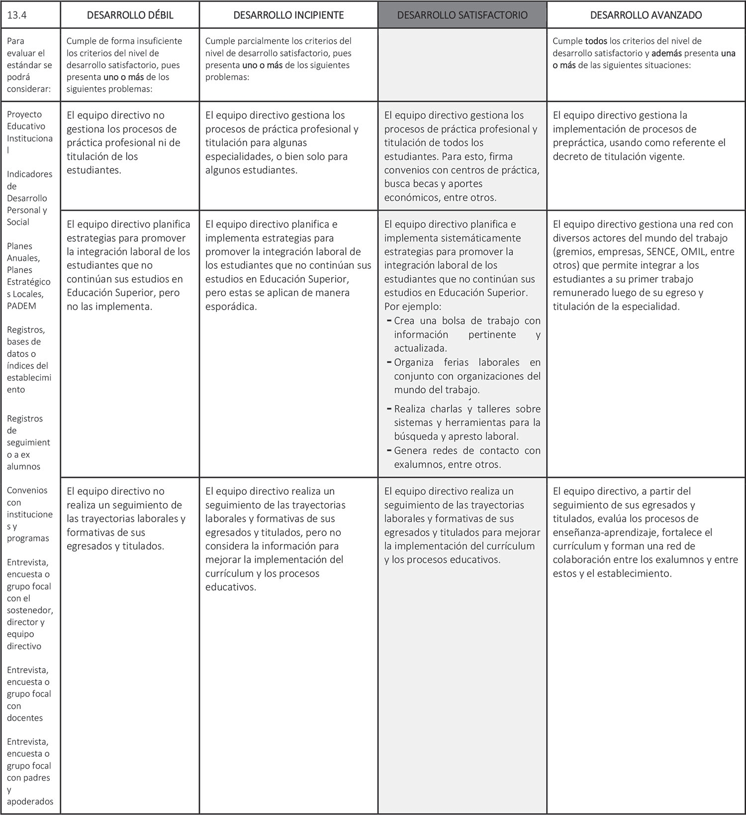 Estándar 13.4: El equipo directivo apoya la integración de sus egresados y titulados al mundo del trabajo y realiza un seguimiento de su trayectoria laboral temprana.
