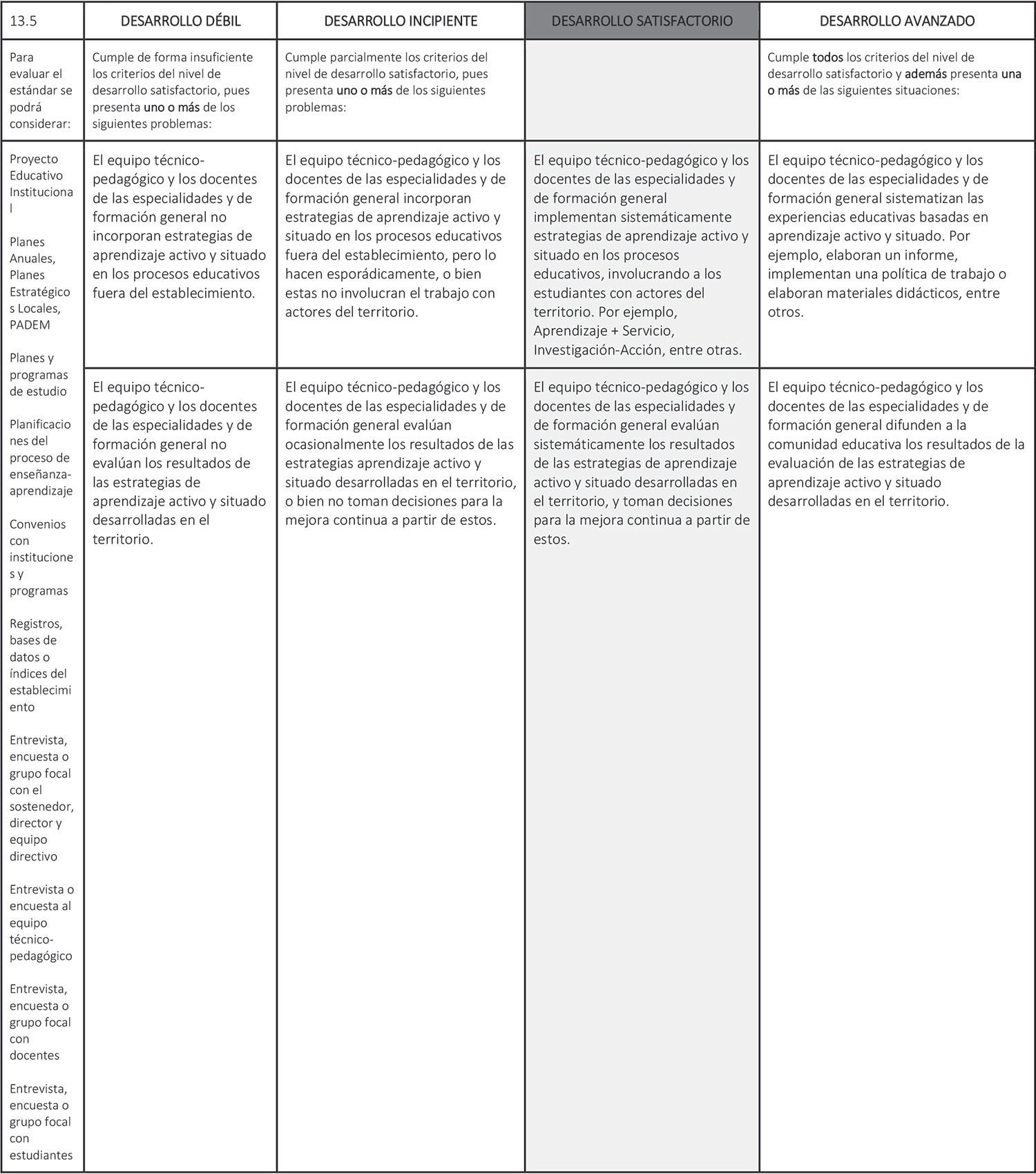 Estándar 13.5: El equipo técnico-pedagógico y los docentes de las especialidades y de formación general implementan estrategias educativas basadas en el aprendizaje activo y situado, que promuevan la relación entre los estudiantes y el territorio.